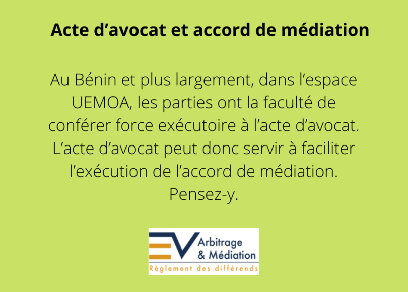 Au Bénin et plus largement, dans l’espace UEMOA, les parties ont la faculté de conférer force exécutoire à l’acte d’avocat. L’acte d’avocat peut donc servir à faciliter l’exécution de l’accord de médiation. Pensez-y.