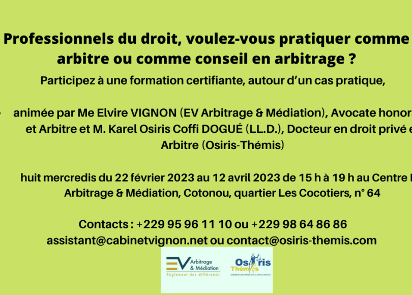 § Me Elvire VIGNON (EV Arbitrage & Médiation), Avocate honoraire et Arbitre et M. Karel Osiris Coffi DOGUÉ (LL.D.), Docteur en droit privé et Arbitre (Osiris-Thémis)