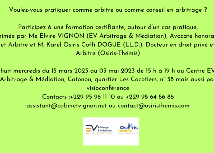 Participez à une formation certifiante, autour d’un cas pratique, animée par Me Elvire VIGNON (EV Arbitrage & Médiation), Avocate honoraire et Arbitre et M. Karel Osiris Coffi DOGUÉ (LL.D.), Docteur en droit privé et Arbitre (Osiris-Thémis).